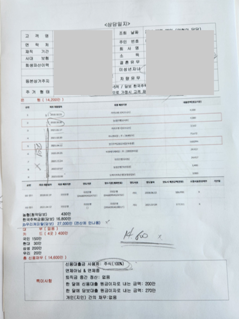 실장님이 상담실로 찾아왔고, 이미 전화 상담 때 했던 이야기지만 다시 한번 전체적으로 상담을 받기 시작했습니다. 소득과 채무 상황, 가족관계, 채무 사유 등을 다시 확인하고 변제금을 계산해줬습니다.